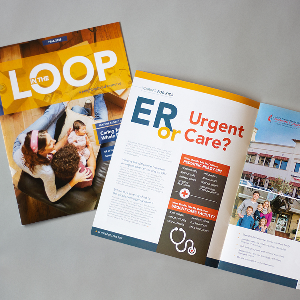 - Magazines – We also created a special magazine, In the Loop, to specifically reach new residents who recently moved into the same neighborhoods. These magazines gave a more in-depth overview of the Metropolitan Methodist Hospital and Quarry ER, still including information like location, but also education on preventative care and when to visit the ER versus an urgent care center or a full-service hospital.